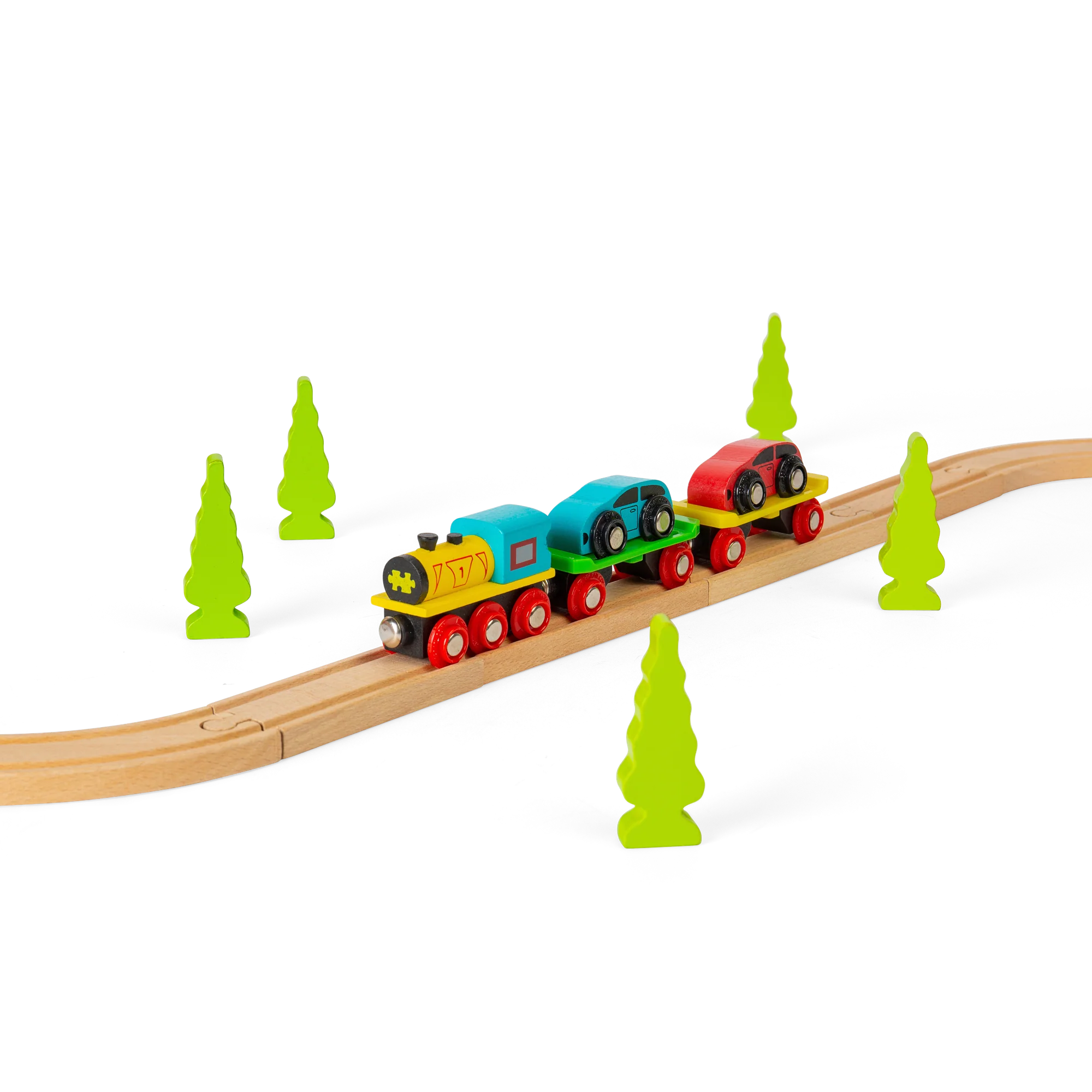This popular wooden train accessory includes a wooden engine, two wagons and a car ramp. Supplied with two pieces of wooden train track, too. Ideal for lots of imaginative playtime and great for developing kids' hand/eye coordination as they move the car loader along the wooden railway network.