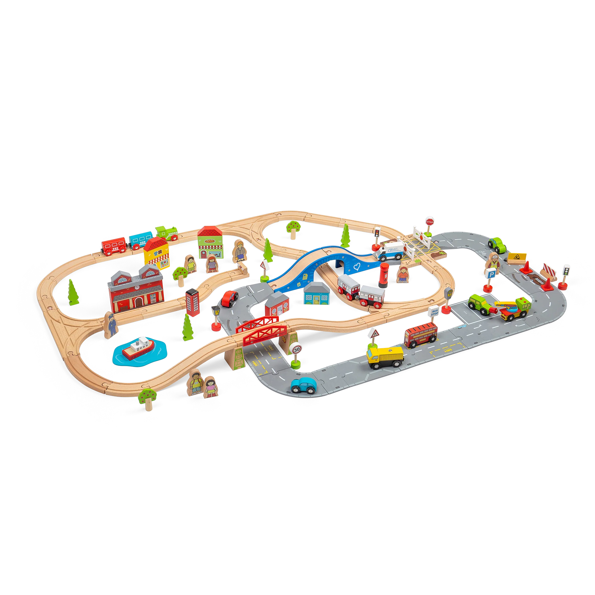 Trains and cars meet at the level crossing, passengers wait at the station, and there's even a boat to carry passengers across the lake. The ideal Bigjigs Road and Rail link train set!